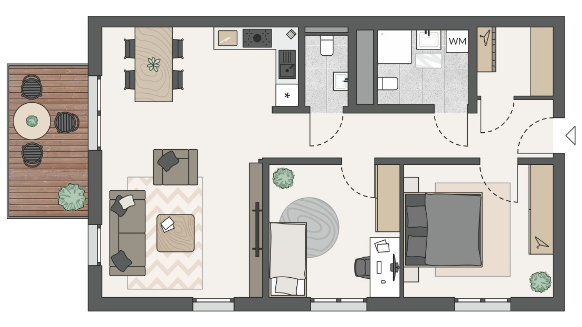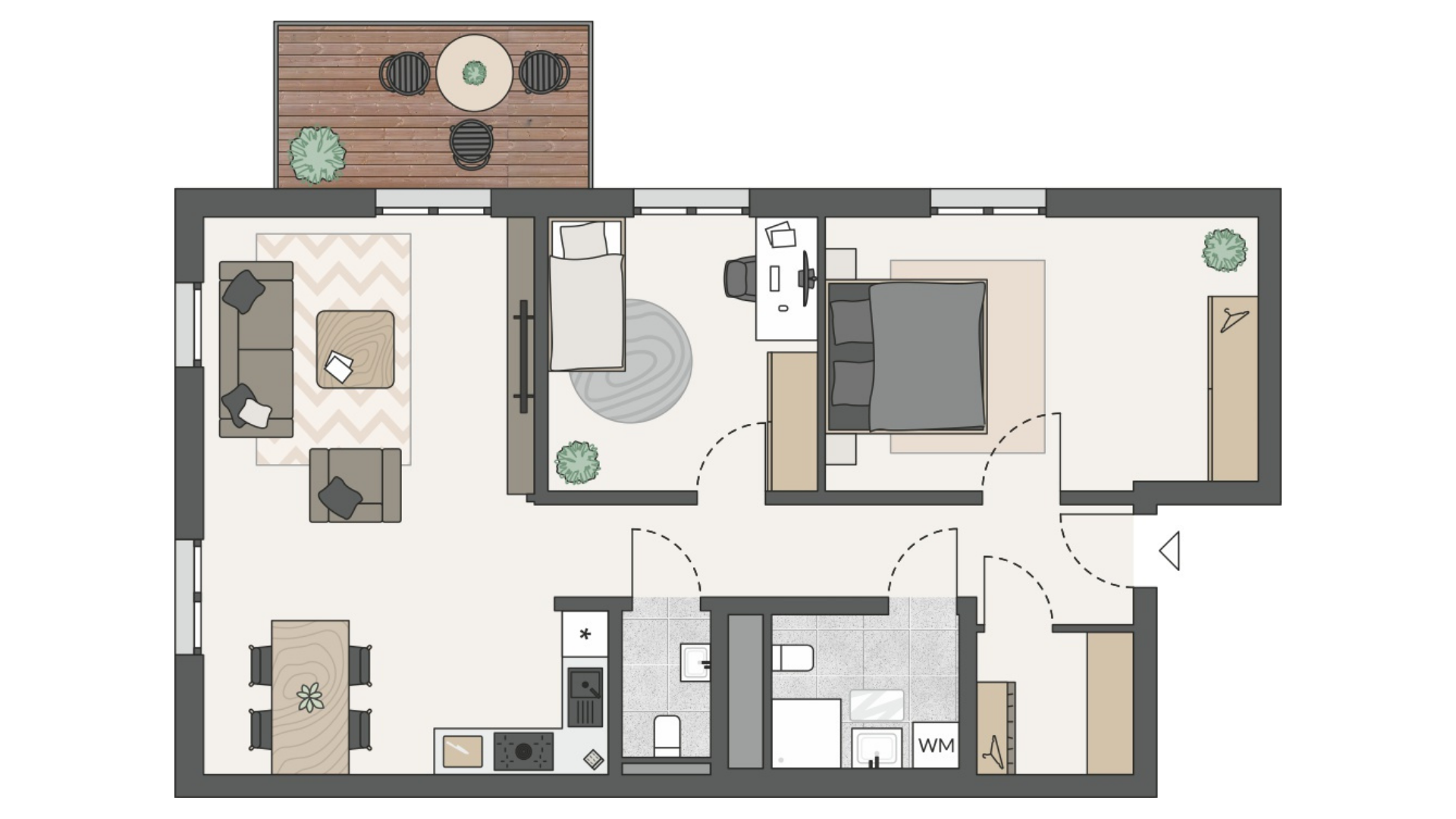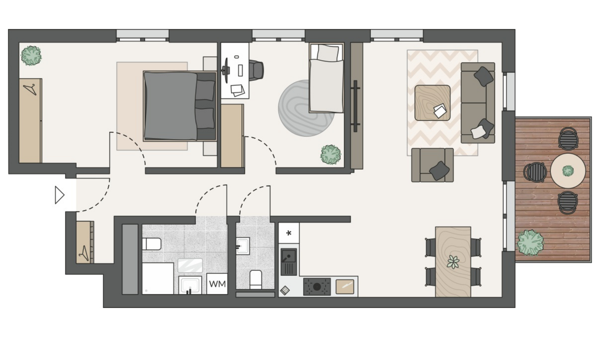 Die Wohnungen im 1. Obergeschoss verbinden durchdachte Grundrisse mit einem gemütlichen Außenbereich. Der offen gestaltete Wohn-, Ess- und Kochbereich führt direkt auf den Balkon und schafft ein angenehmes Wohngefühl mit zusätzlichem Freiraum. Praktische Details wie eine Garderobennische bzw. ein Abstellraum sorgen für Ordnung im Alltag. Für mehr Komfort und Privatsphäre verfügen die Wohnungen neben dem Duschbad jeweils über ein zusätzliches Gäste-WC. Helle Schlaf-, Kinder- oder Gästezimmer lassen sich flexibel nutzen und eignen sich auch ideal als Home-Office.
